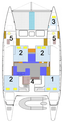 Swift features 3 double cabins for guests with large powerful fans and opening hatches providing good ventilation throughout the yacht. The cabin's are segregated for privacy by sliding curtains and forward are two large toilet / shower units, one in each hull as well as a further two showers on the aft decks, ideal for a freshwater rinse off after enjoying a swim.